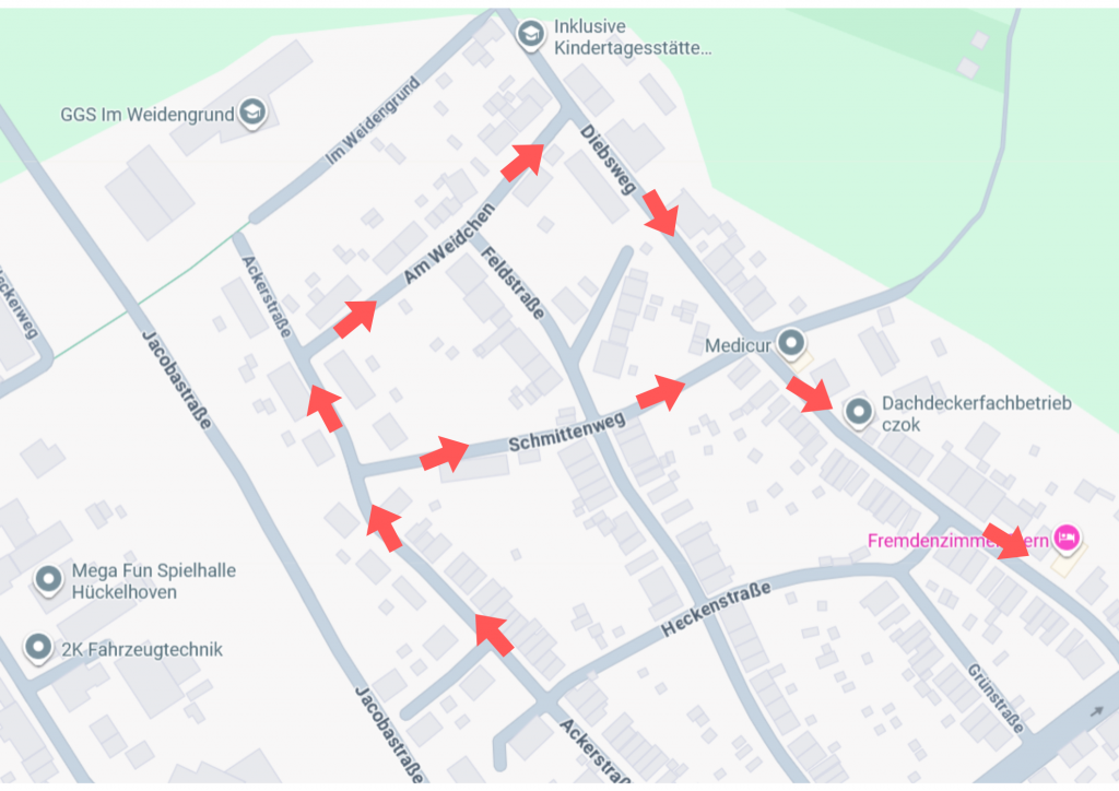 - Die Abfahrt erfolgt anschließend über den „Diebsweg“ oder „Feldstraße“ aus dem Wohngebiet heraus